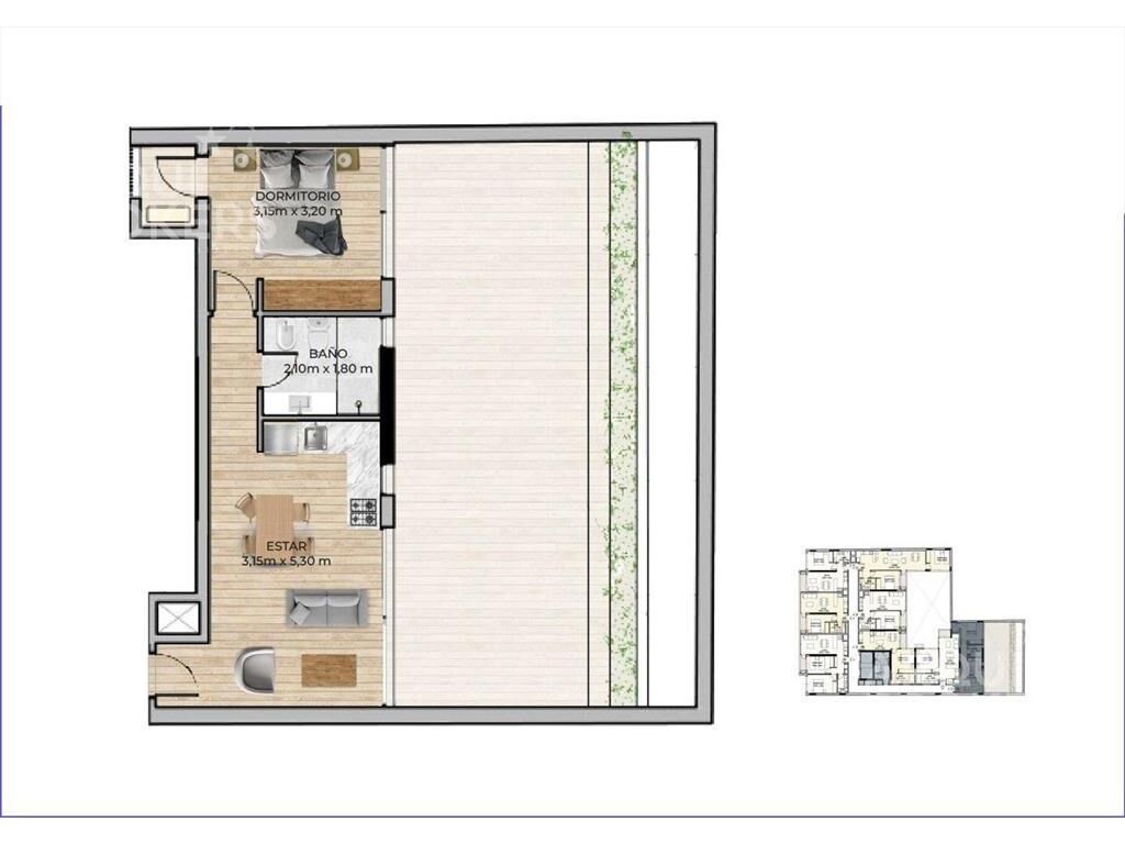 Living comedor con salida a patio de 65.5 m2, cocina integrada con placares, anafe y termotanque, 1 dormitorio en suite con placard, 1 baño completo.