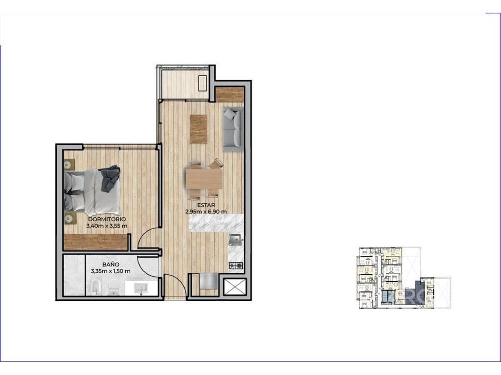 Living comedor con terraza, cocina integrada con placares, anafe y termotanque, 1 dormitorio con placard, 1 baño completo.