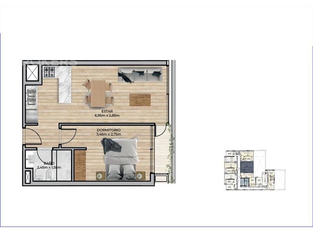 Living comedor con terraza, cocina integrada con placares, anafe y termotanque, 1 dormitorio con placard, 1 baño completo.