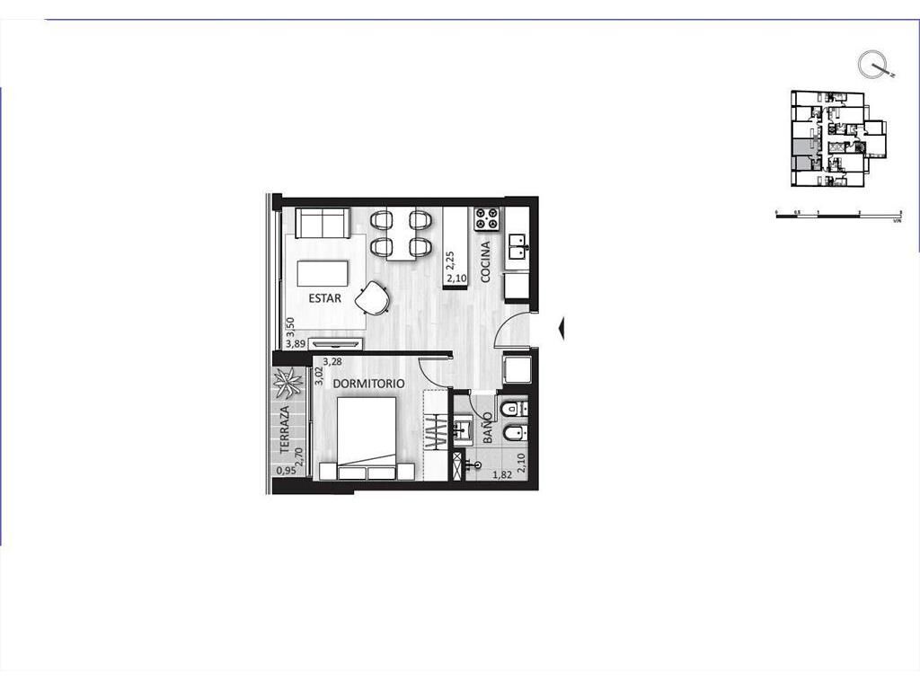 Living comedor con terraza al frente, cocina integrada con placard inferior, 1 dormitorio al frente con cortina de enrollar, 1 baño completo.