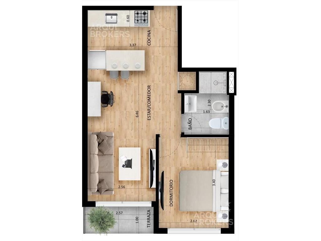 Living comedor con terraza, cocina integrada con placares bajo y sobre mesada, campana, horno y anafe, 1 dormitorio, 1 baño.