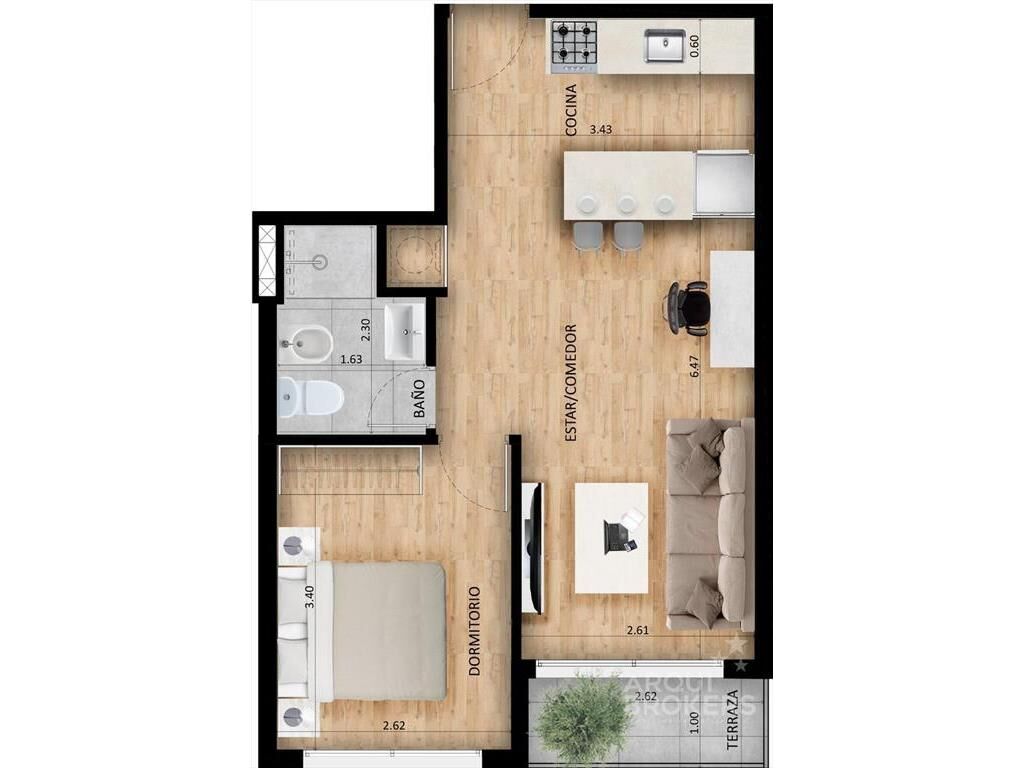 Living comedor con terraza, cocina integrada con placares bajo y sobre mesada, campana, horno y anafe, 1 dormitorio, 1 baño.