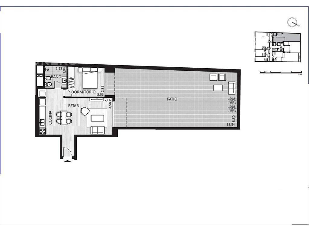 Living comedor con cocina integrada con placard inferior, 1 dormitorio con cortina de enrollar, 1 baño completo. patio de 72m2.