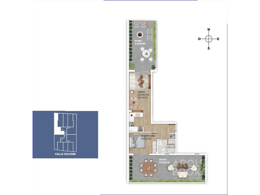 Living comedor con terraza y salida a patio, cocina integrada con placares, 1 dormitorio con salida a otro patio, 1 baño.