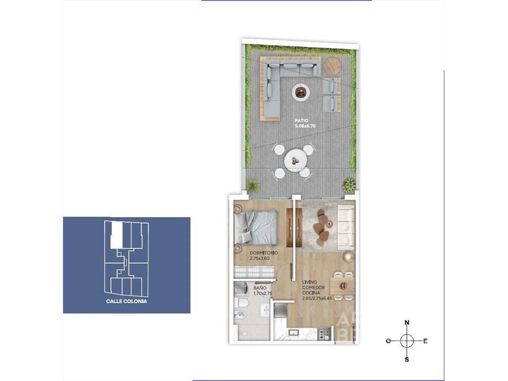 Living comedor con terraza y patio de 30 m2, cocina integrada con placares, 1 dormitorio, 1 baño.