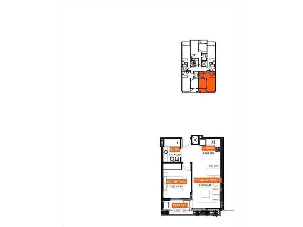 Living comedor con terraza al frente, cocina integrada con placares, 1 dormitorio, 1 baño completo.