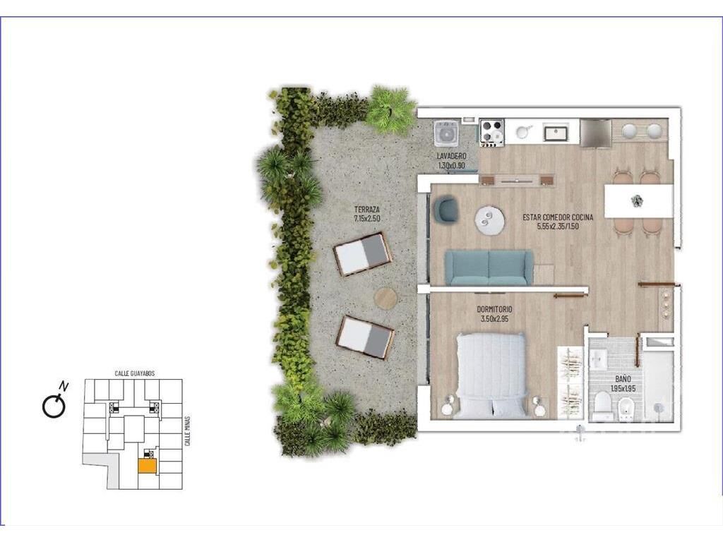 Living comedor con terraza de 14 m2, cocina integrada con placares, 1 dormitorio y 1 baño.