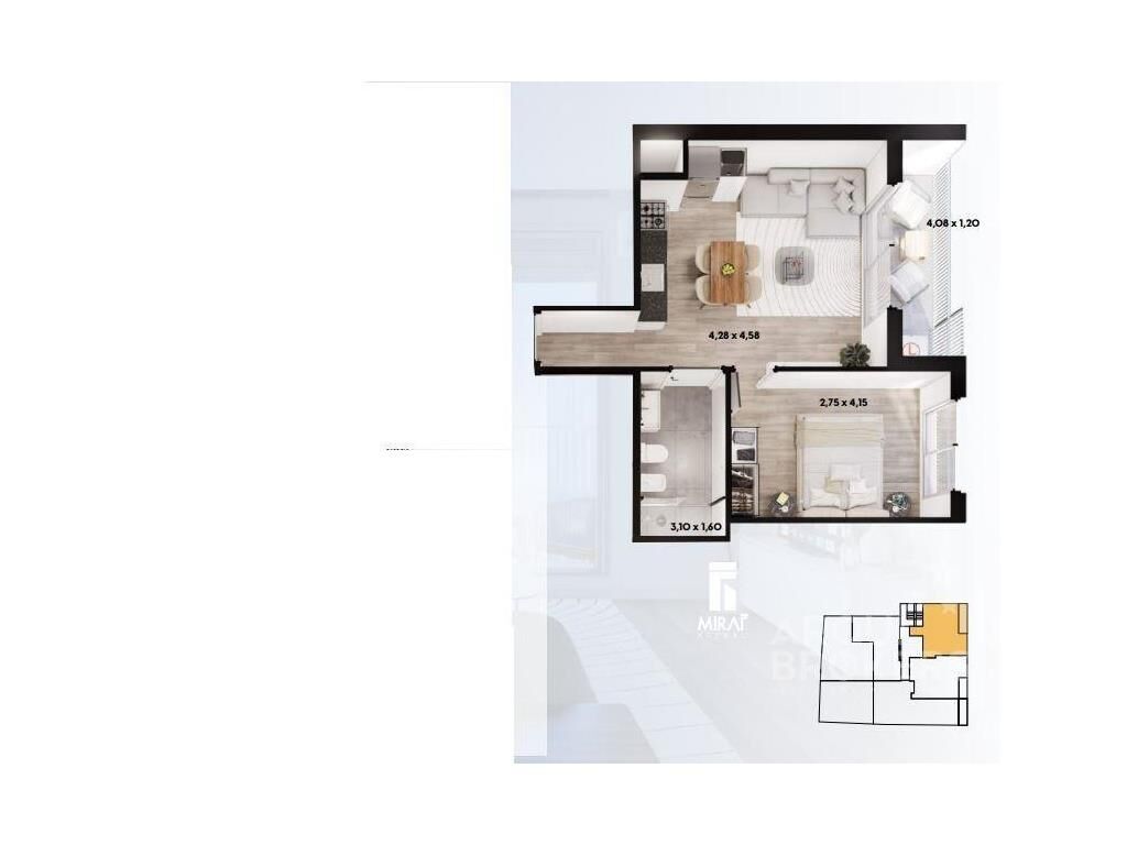 Living comedor con terraza al frente, cocina integrada con placares y mueble para lavarropas y calefón, 1 dormitorio con placard, 1 baño