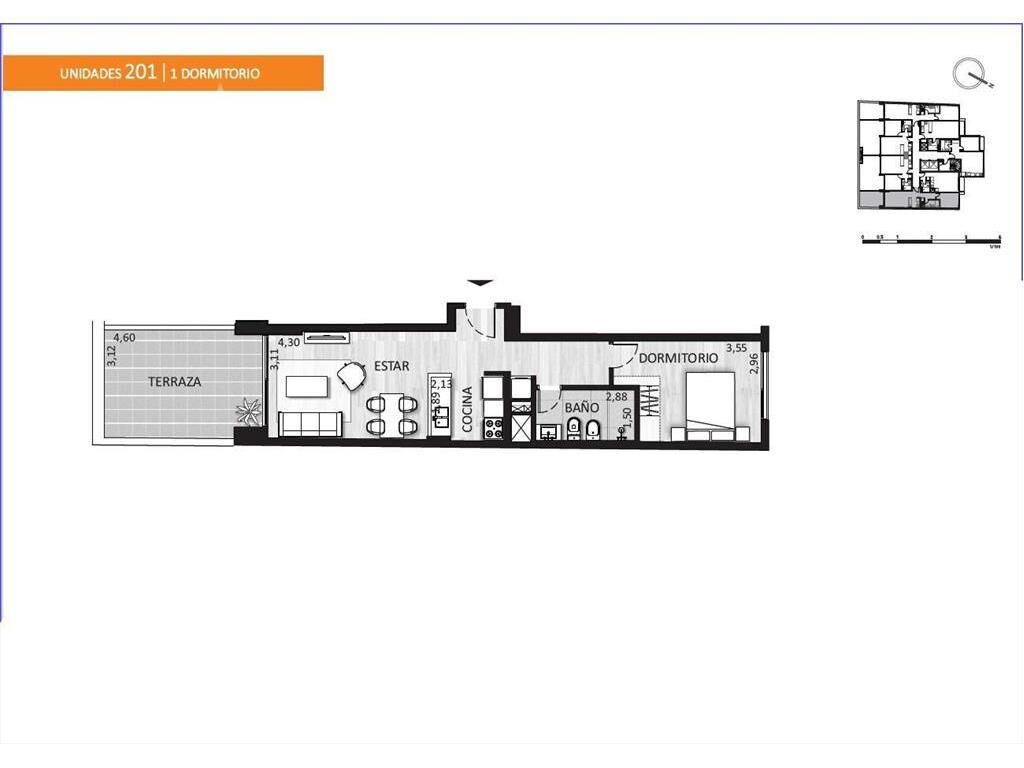 Living comedor con terraza al frente de 15m2, cocina integrada con placard inferior, 1 dormitorio hacia atrás con cortina de enrollar, 1 baño completo.