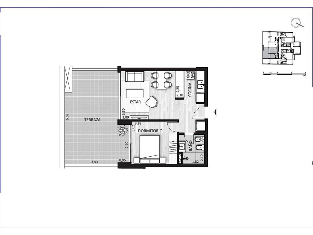 Living comedor con terraza al frente de 27m2, cocina integrada con placard inferior, 1 dormitorio al frente con cortina de enrollar, 1 baño completo.