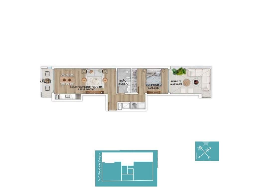 Living comedor con terraza al frente, cocina integrada con placares y extractor, placard para lavarropas, 1 dormitorio con terraza de 14 m2
