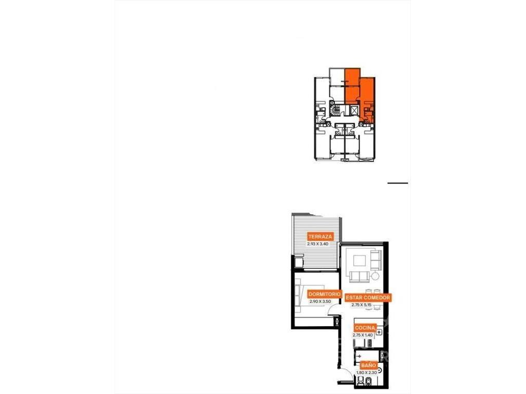 Living comedor con terraza de 11m2, cocina integrada con placares, 1 dormitorio, 1 baño completo.