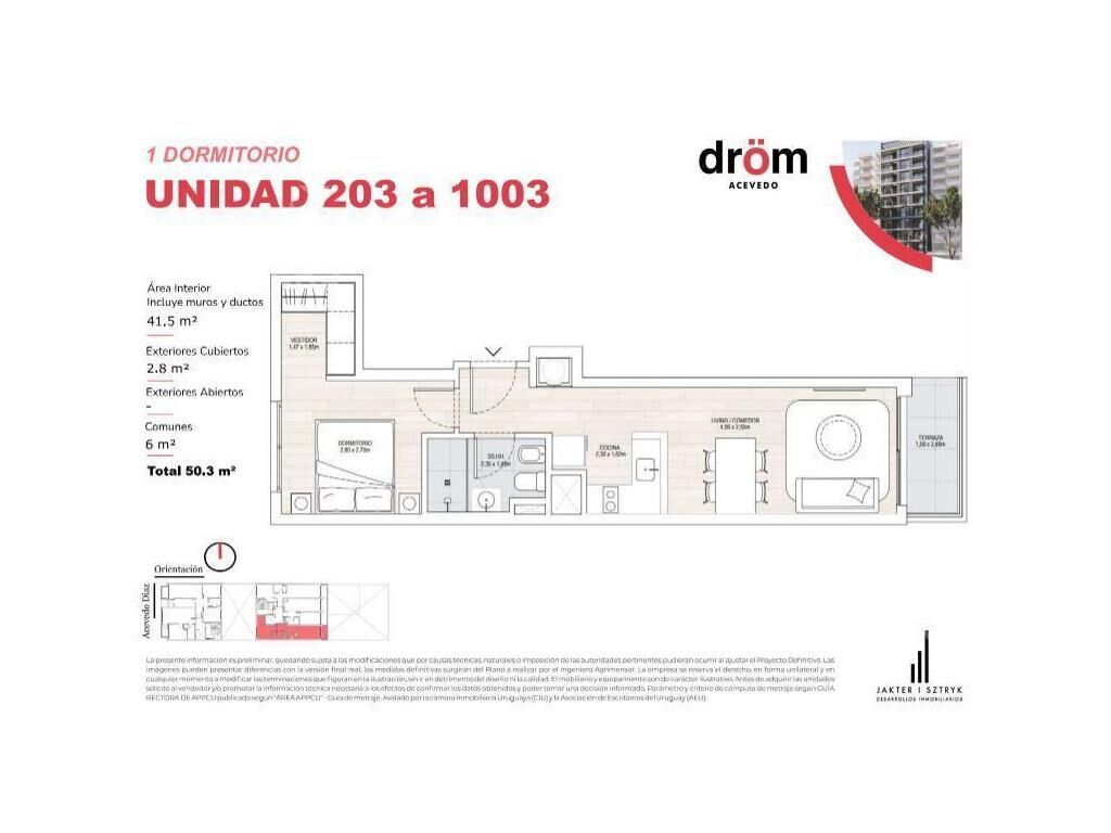 Living comedor con terraza, cocina integrada con placares, 1 dormitorio con vestidor y cortina de enrollar, 1 baño completo.