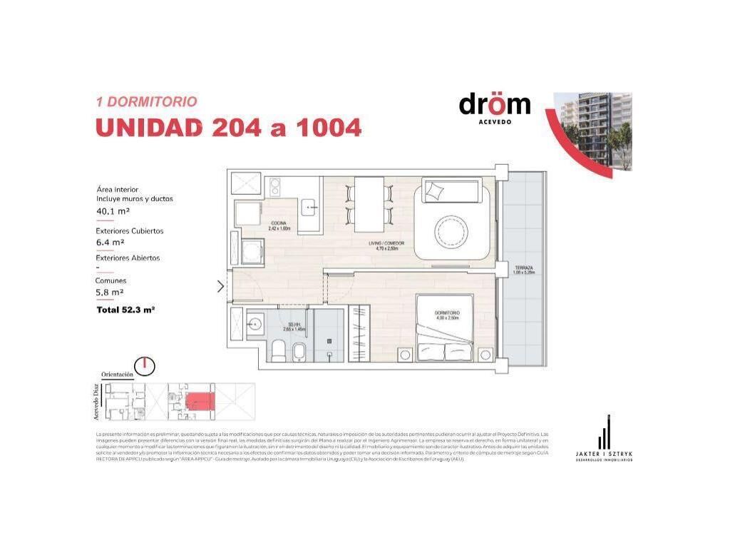 Living comedor con terraza, cocina integrada con placares, 1 dormitorio con cortina de enrollar, 1 baño completo.