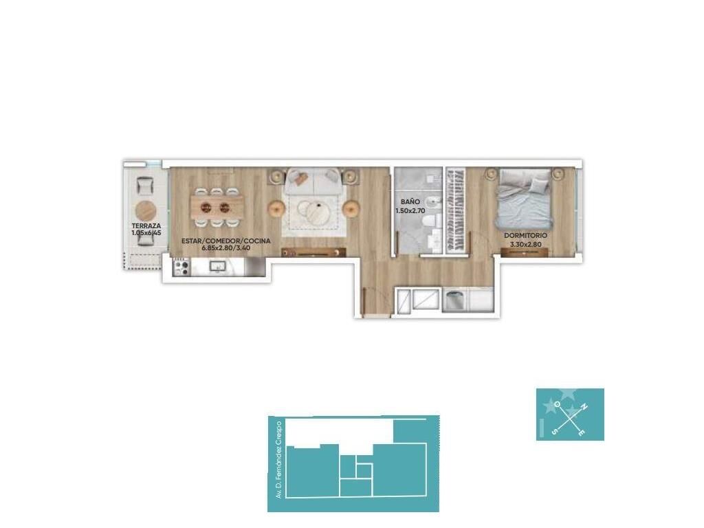Living comedor con terraza al frente, cocina integrada con placares y extractor, placard para lavarropas, 1 dormitorio, 1 baño con mueble,
