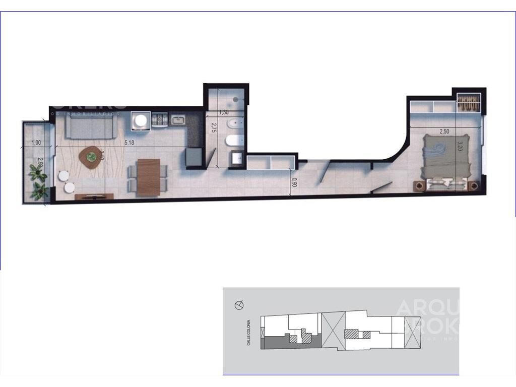 Living comedor con terraza al frente, cocina integrada con placares, 1 dormitorio con placard, lugar para lavarropas, 1 baño.