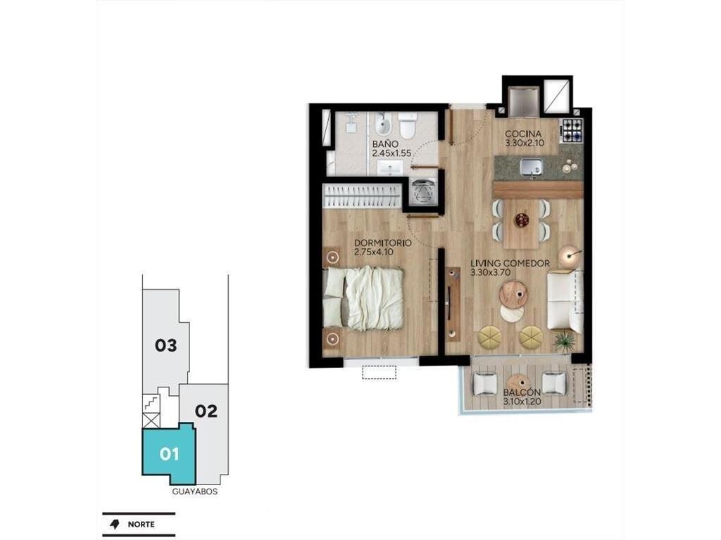 Living comedor con terraza al frente, cocina integrada con placares y campana, 1 dormitorio al frente, 1 baño completo con extractor.