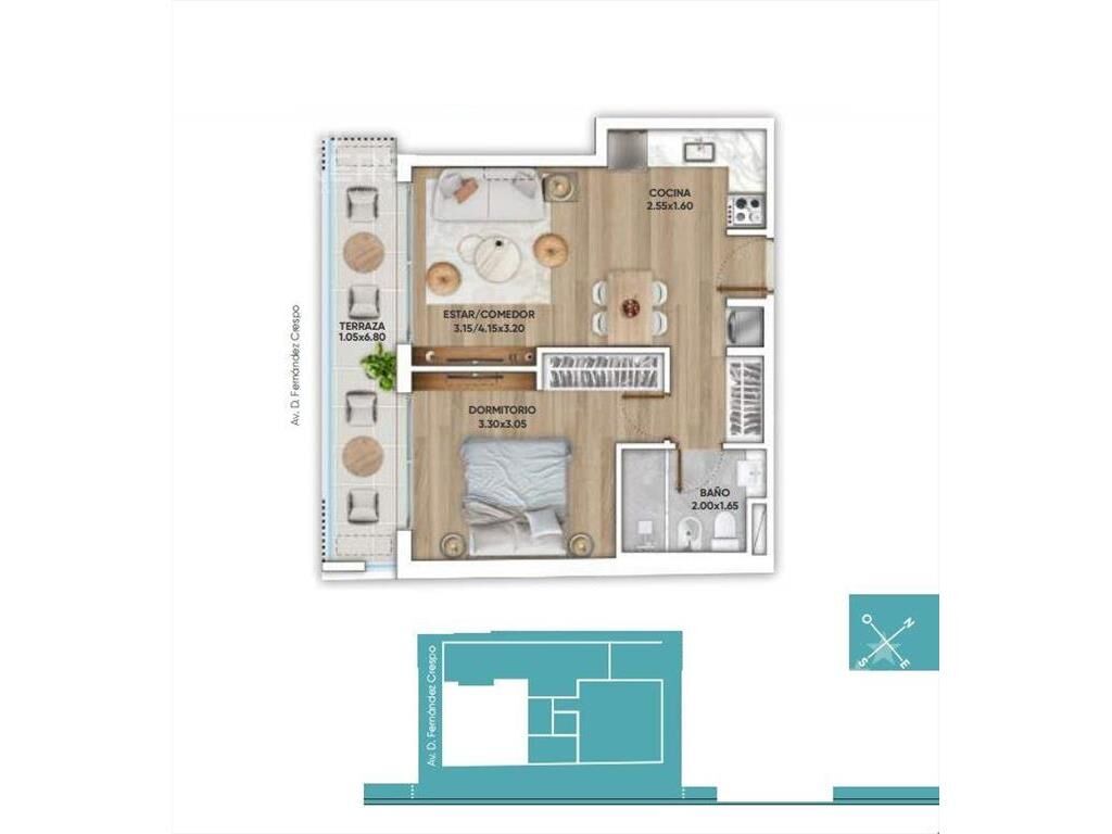Living comedor con terraza al frente, cocina integrada con placares y extractor, placard para lavarropas, 1 dormitorio con salida a la terraza, 1