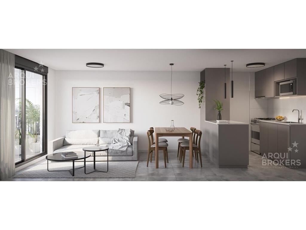 Living comedor con terraza al frente, cocina integrada con placares y barra, 1 dormitorio al frente con placard, lugar para lavarropas, 1 baño.