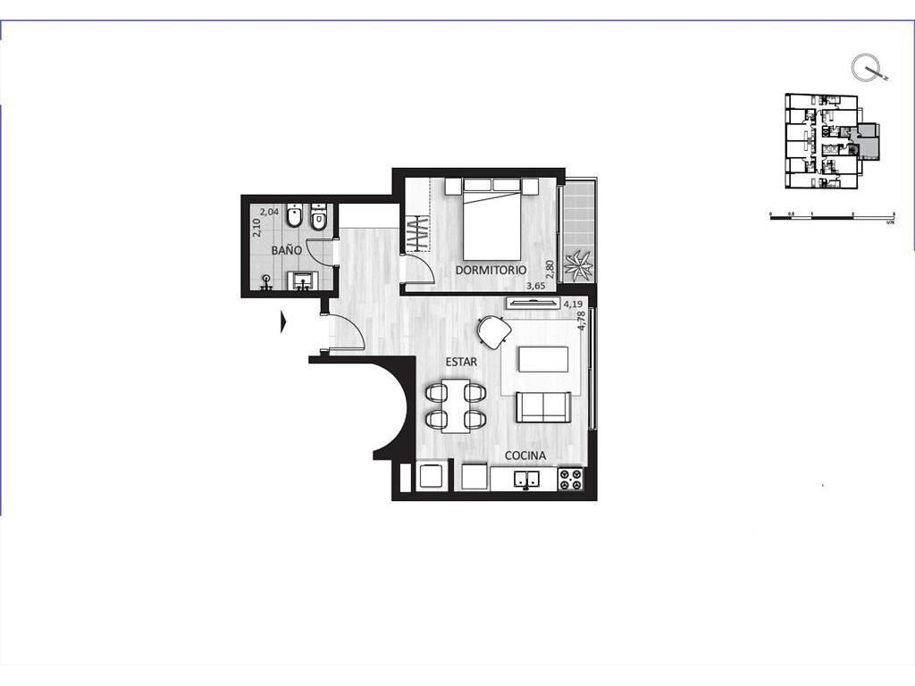 Living comedor con terraza, cocina integrada con placard inferior, 1 dormitorio con cortina de enrollar, 1 baño completo.