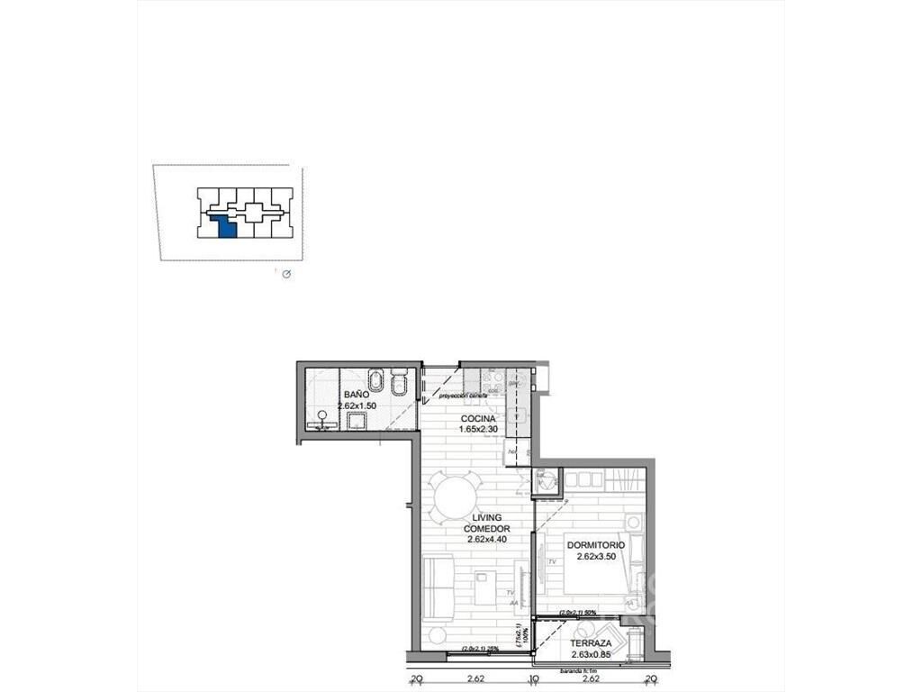 Living comedor con terraza, cocina integrada con placares, 1 dormitorio y 1 baño.