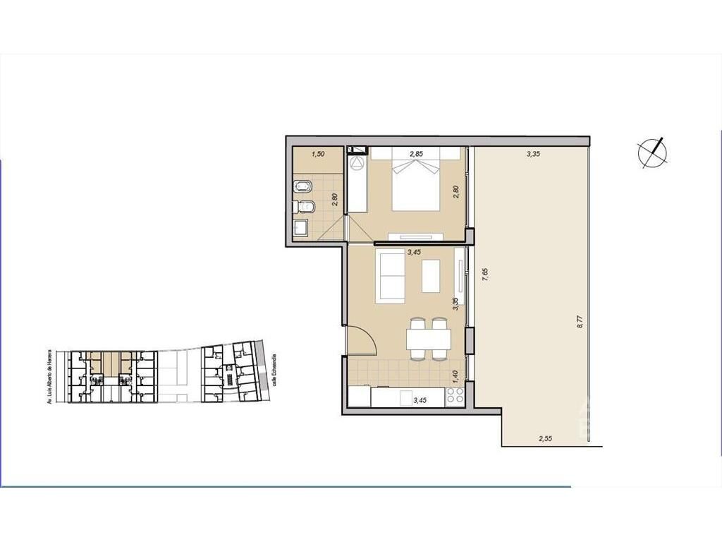 Living comedor con salida a patio de 28m2, cocina integrada con placares, 1 dormitorio, 1 baño.