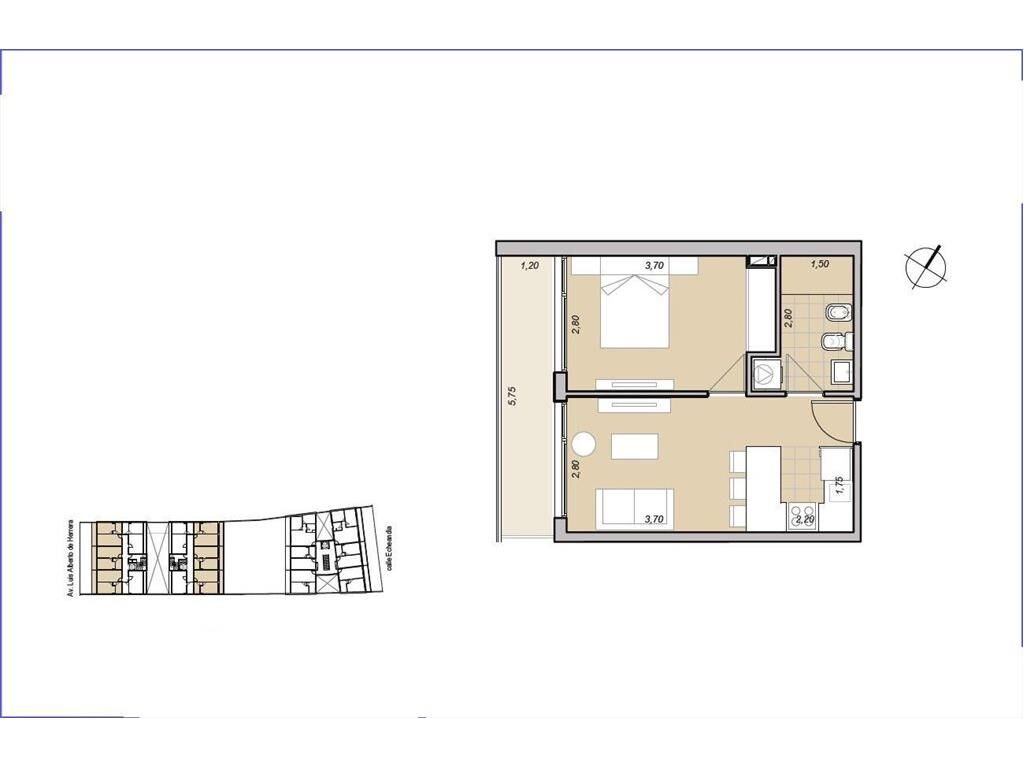 Living comedor con terraza al frente, cocina integrada con placares, 1 dormitorio, 1 baño.