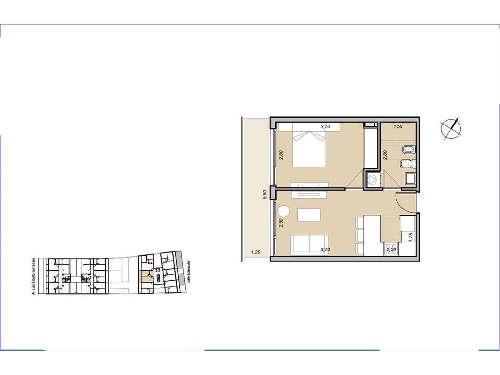 Living comedor con terraza, cocina integrada con placares, 1 dormitorio con salida a terraza, 1 baño.