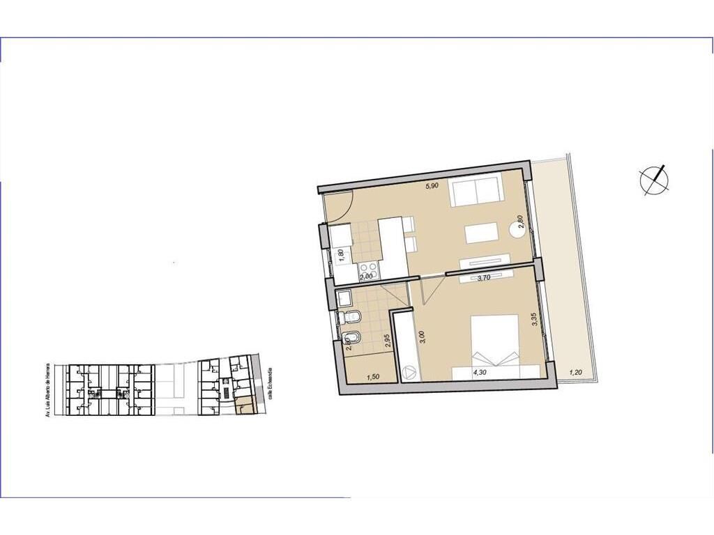 Living comedor con terraza, cocina integrada con placares, 1 dormitorio con salida a terraza, 1 baño.