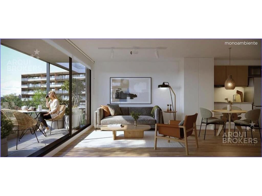 Living comedor con terraza, cocina integrada con placares, 1 dormitorio, 1 baño.