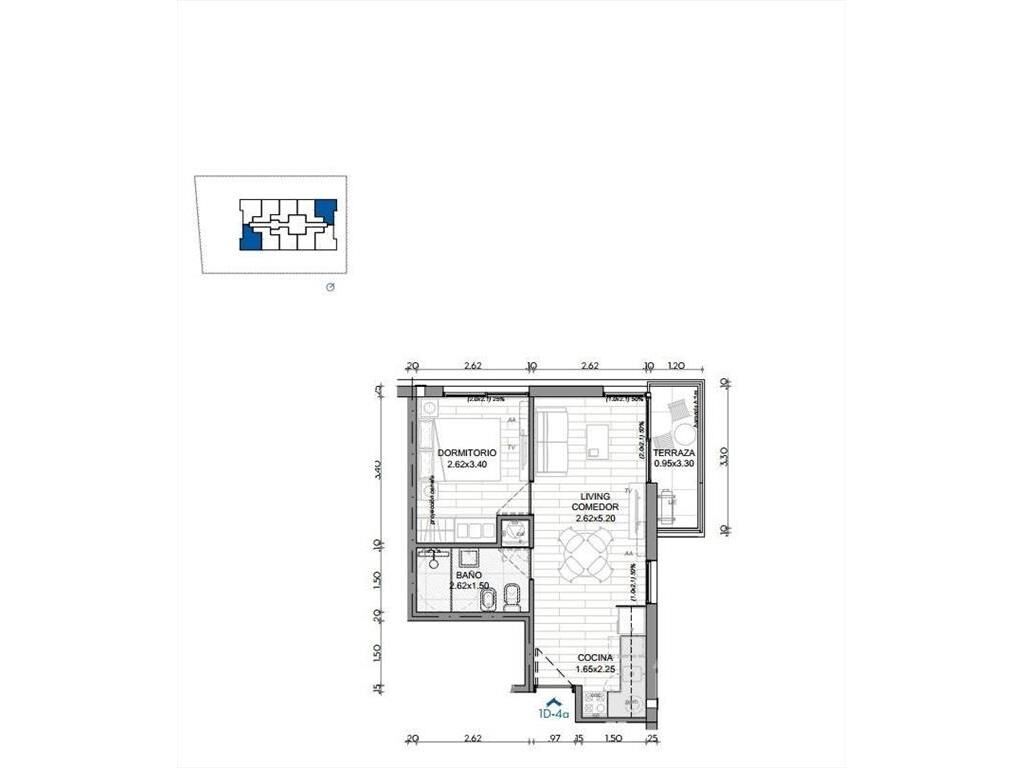 Living comedor con terraza, cocina integrada con placares, 1 dormitorio y 1 baño.