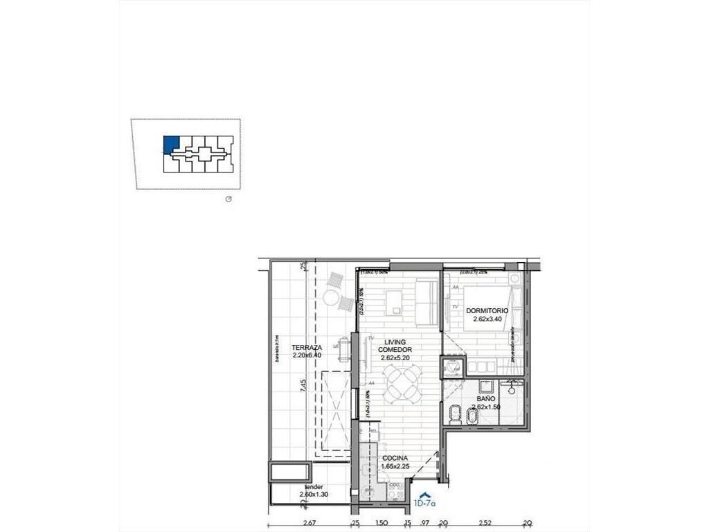 Living comedor con amplia terraza de 21 m2, cocina integrada con placares, 1 dormitorio y 1 baño.