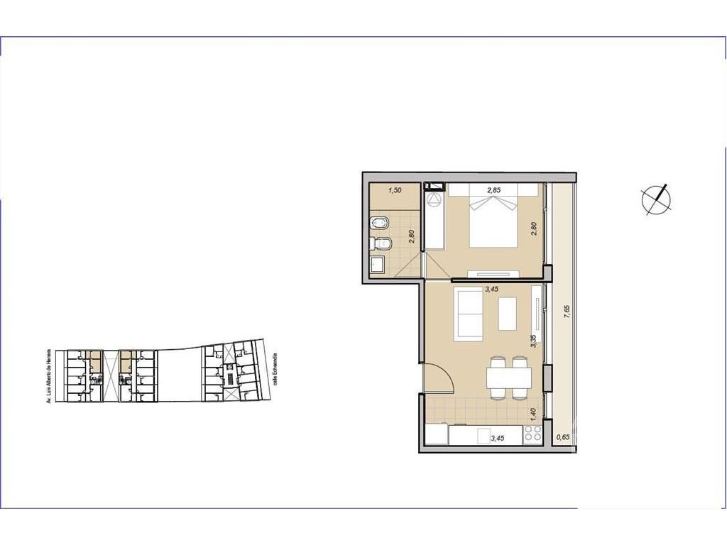 Living comedor con terraza, cocina integrada con placares, 1 dormitorio, 1 baño.