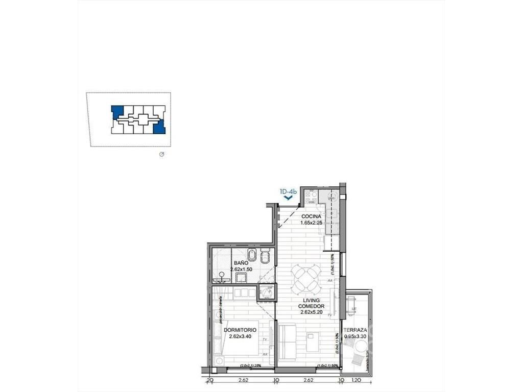 Living comedor con terraza, cocina integrada con placares, 1 dormitorio y 1 baño.