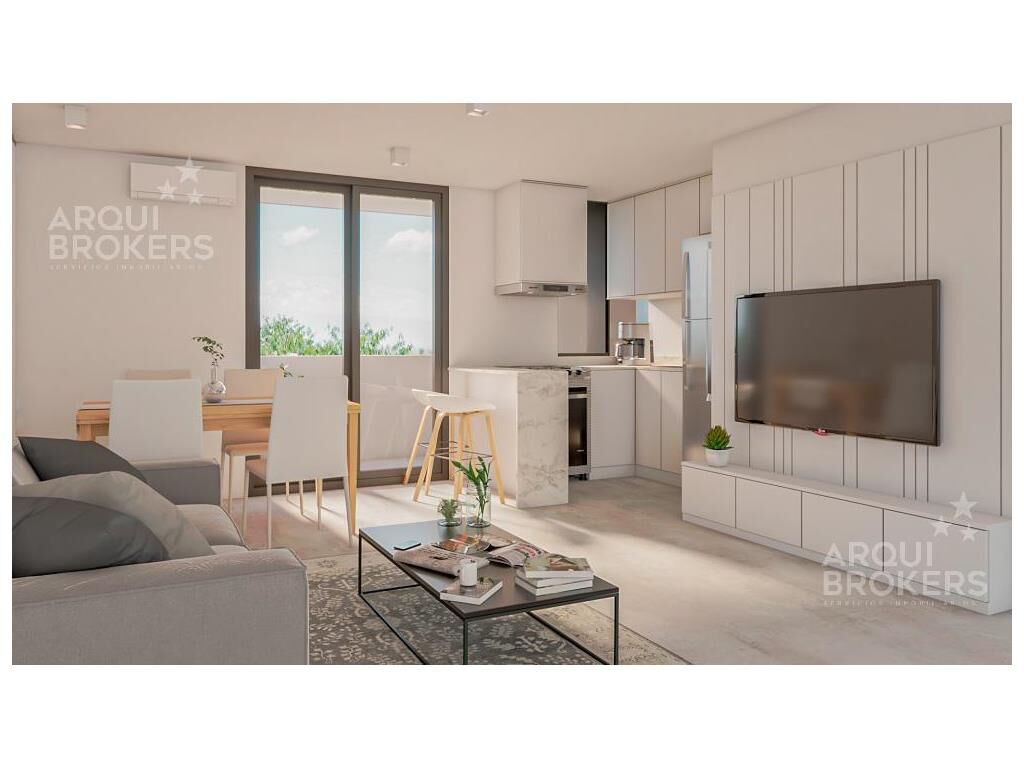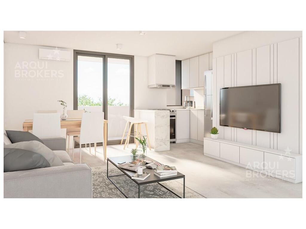Living comedor con terraza, cocina integrada con placares y barra, 1 dormitorio con placard, 1 baño completo.