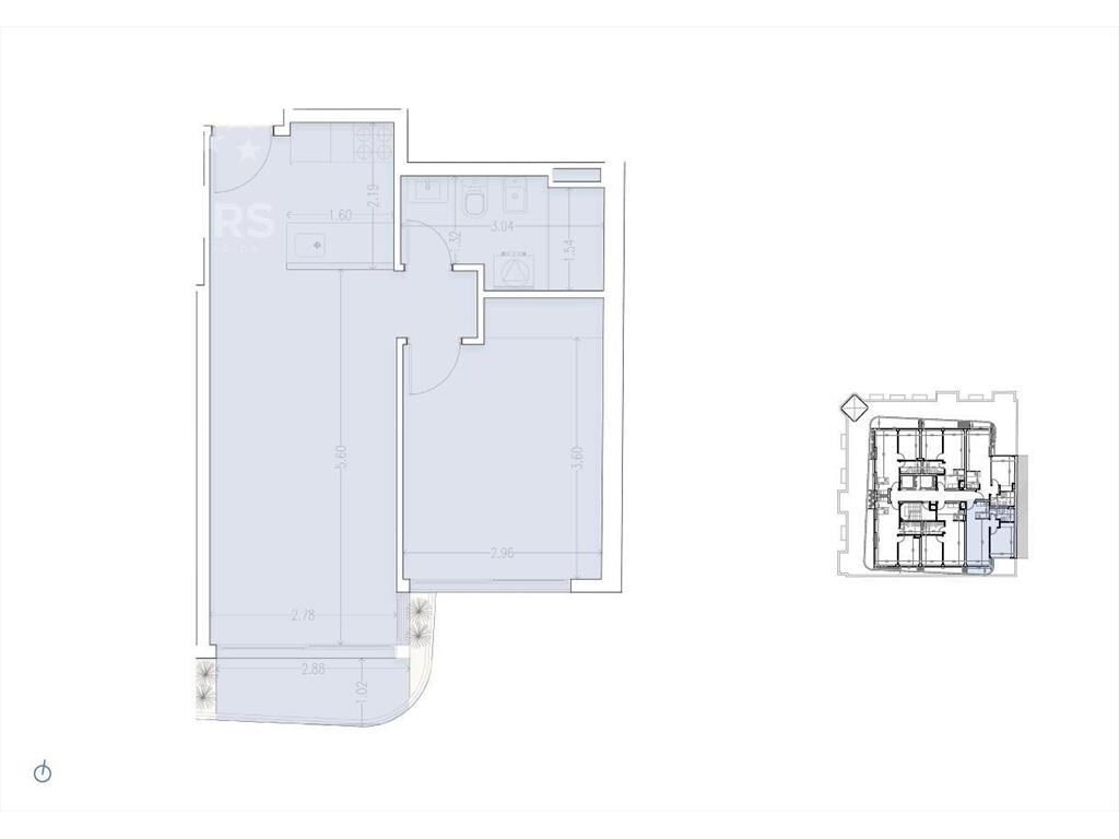 Living comedor con terraza al frente, cocina integrada con placares, 1 dormitorio al frente, 1 baño completo.