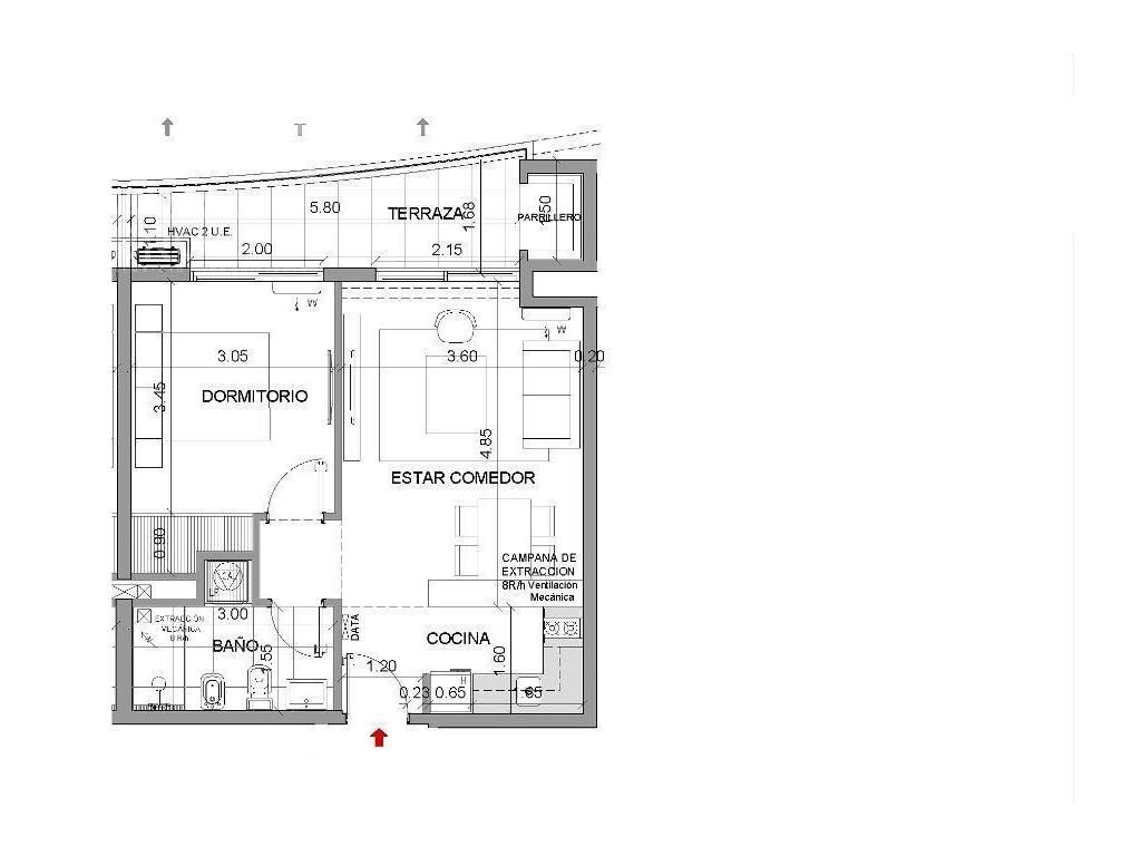 Living comedor con terraza con parrillero, cocina integrada con placares, 1 dormitorio al frente con placard y salida a terraza, 1 baño.