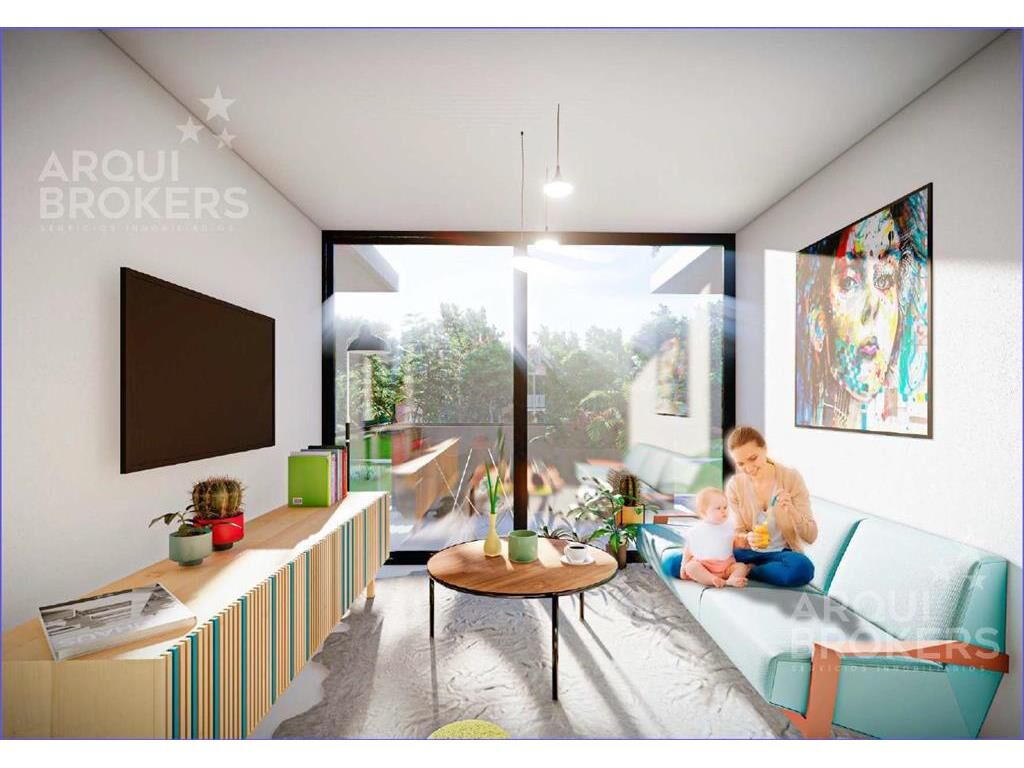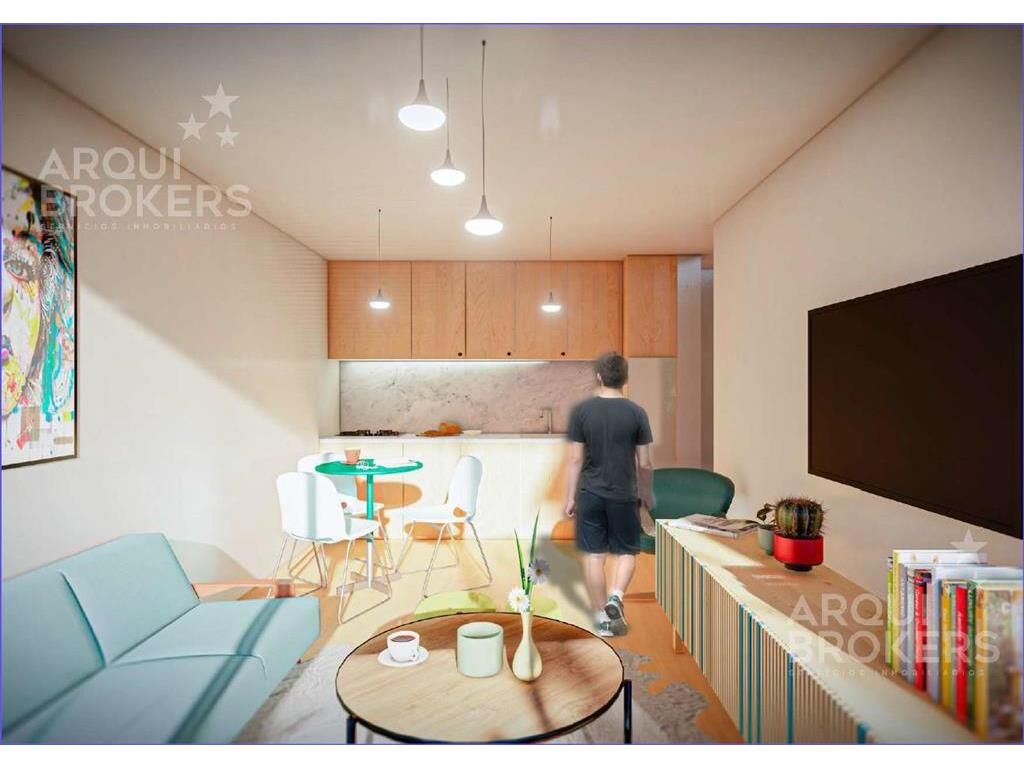 Living comedor con terraza, cocina integrada con placares, 1 dormitorio, 1 baño completo.
