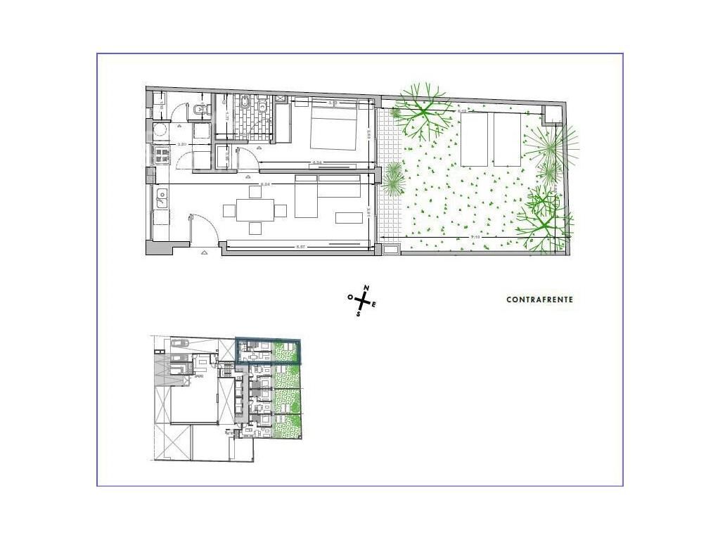 Living comedor con salida a patio de 41 m2, cocina integrada con placares, con bacha de acero inoxidable y mesadas de Silestone, horno anafe y campana de extracción. 1 dormitorio con placard y 1 baño completo.