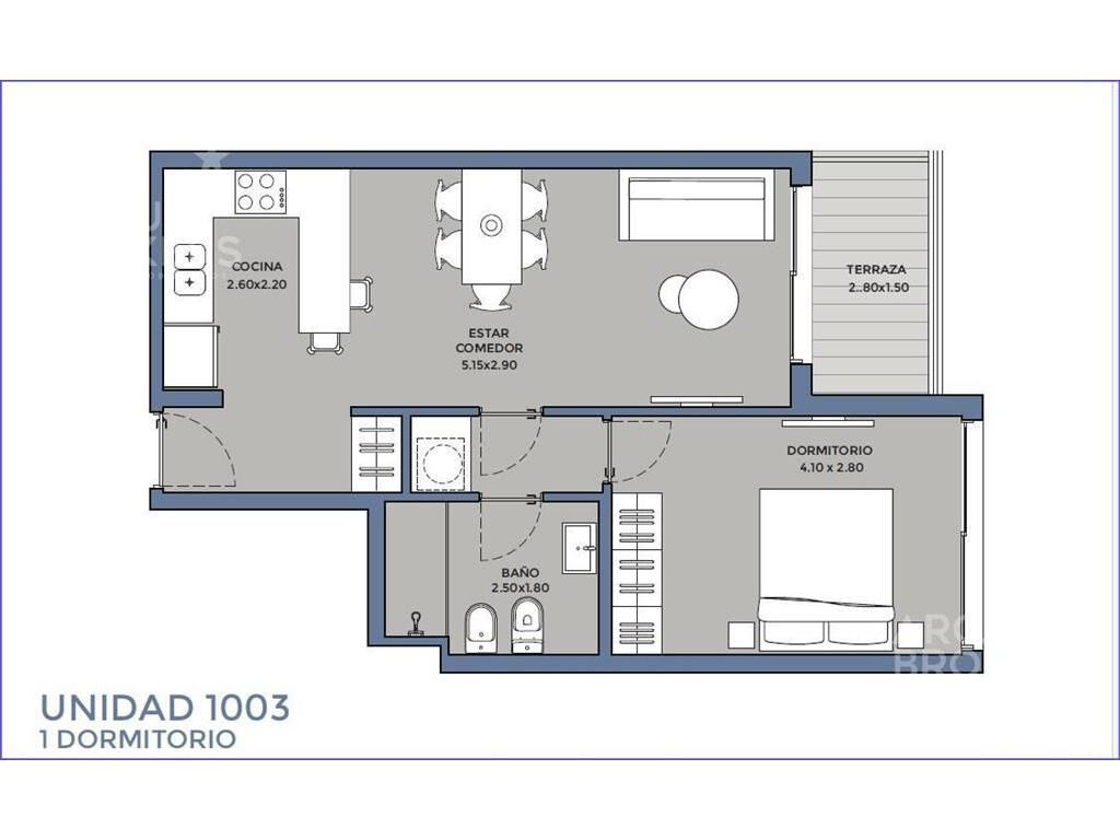 Living comedor con salida a terraza, cocina integrada con placares bajo y sobre mesada, anafe, horno y termofón instalados, lugar para lavarropas, 1 dormitorio con placard, 1 baño completo.