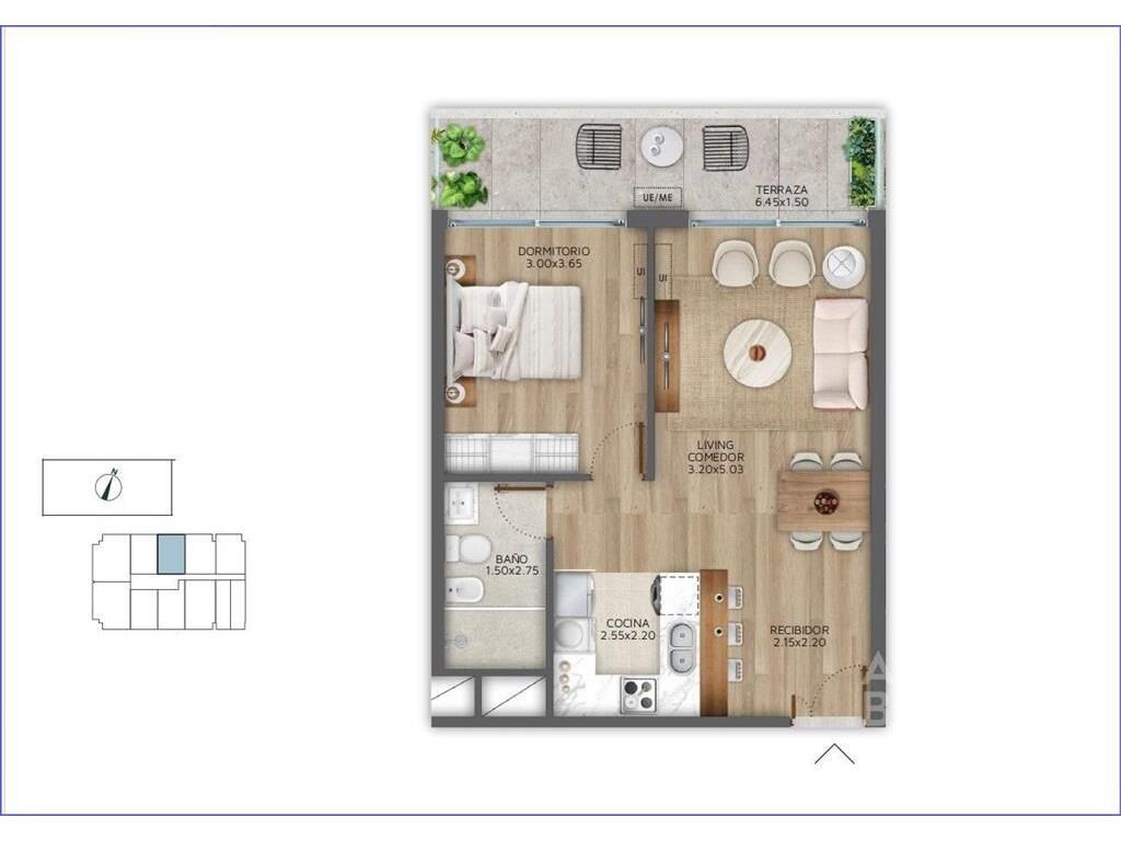 Living comedor con terraza, cocina integrada con placares y campana, horno y anafe, 1 dormitorio con placard y 1 baño completo.
