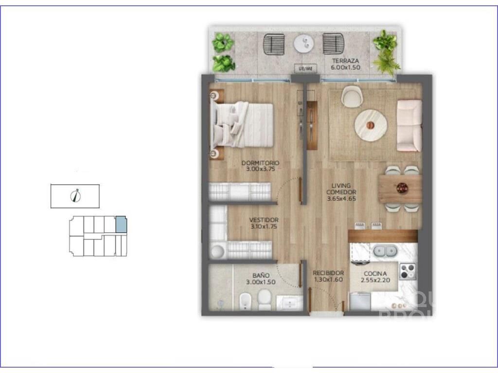 Living comedor con terraza, cocina integrada con placares y campana, horno y anafe, 1 dormitorio con placard y vestidor, 1 baño completo.