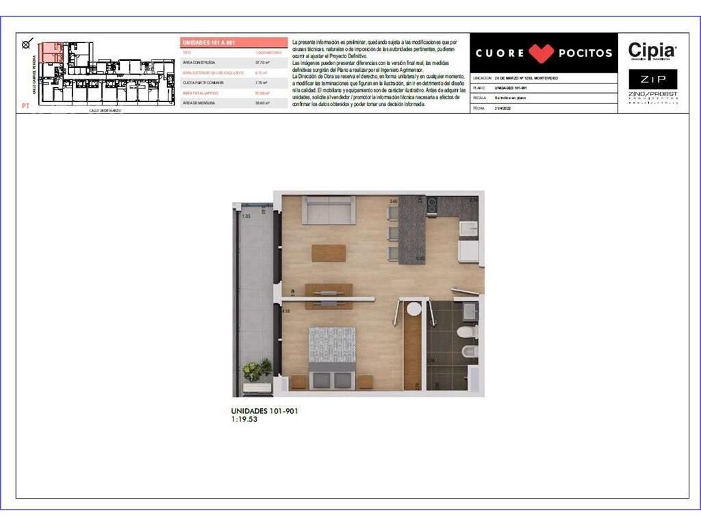 Living comedor con terraza al frente, cocina integrada con placares, 1 dormitorio con placard, 1 baño.