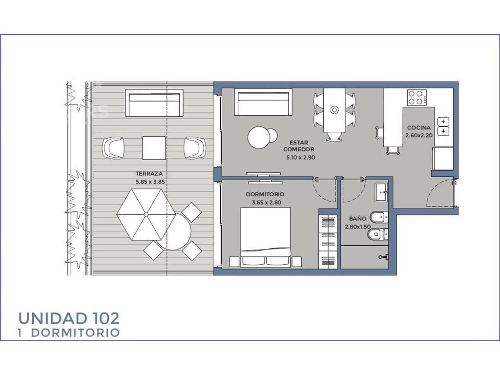 Living comedor con salida a amplia terraza al frente, cocina integrada con placares bajo y sobre mesada, anafe, horno y termofón instalados, 1 dormitorio con placard, 1 baño completo.