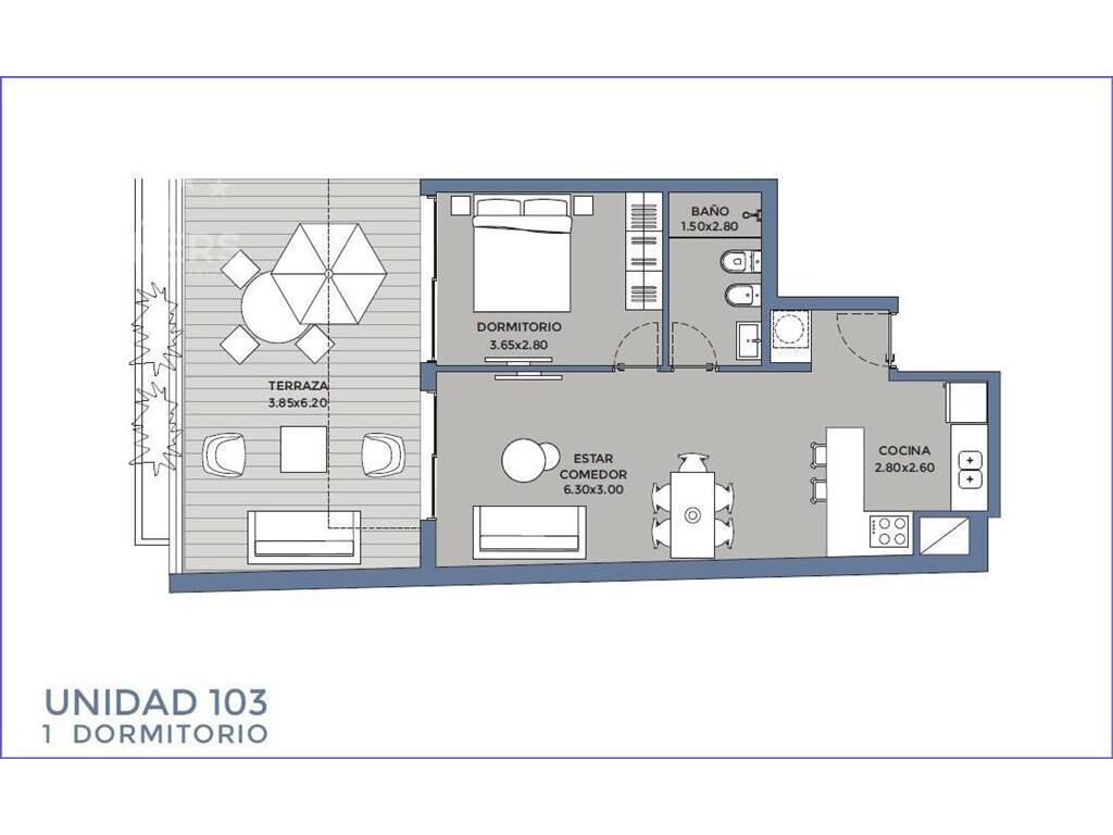 Living comedor con salida a amplia terraza al frente, cocina integrada con placares bajo y sobre mesada, anafe, horno y termofón instalados, 1 dormitorio con placard, 1 baño completo.