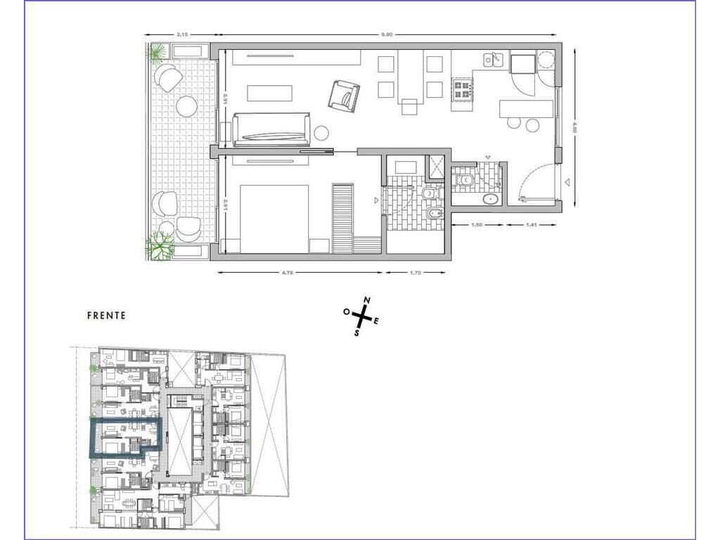 Living comedor con terraza al frente, cocina integrada con placares, con bacha de acero inoxidable y mesadas de Silestone, horno anafe y campana de extracción. 1 dormitorio en suite con vestidor, 1 baño completo y 1 baño social.
