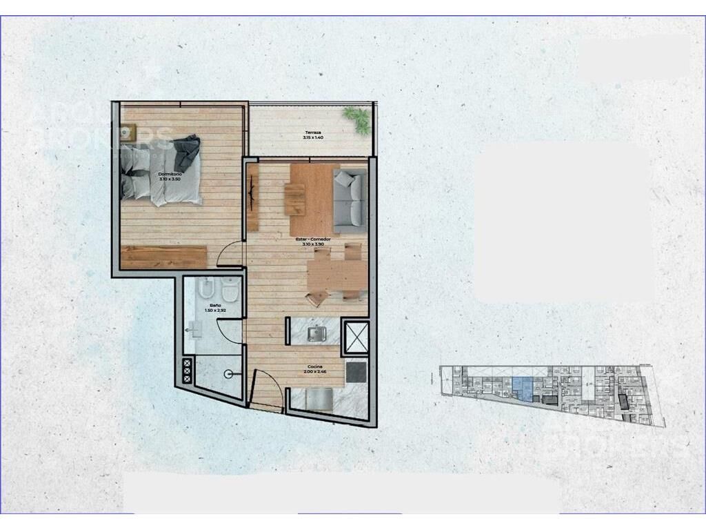 Living comedor con terraza, cocina integrada con placares, 1 dormitorio con placard, 1 baño completo.