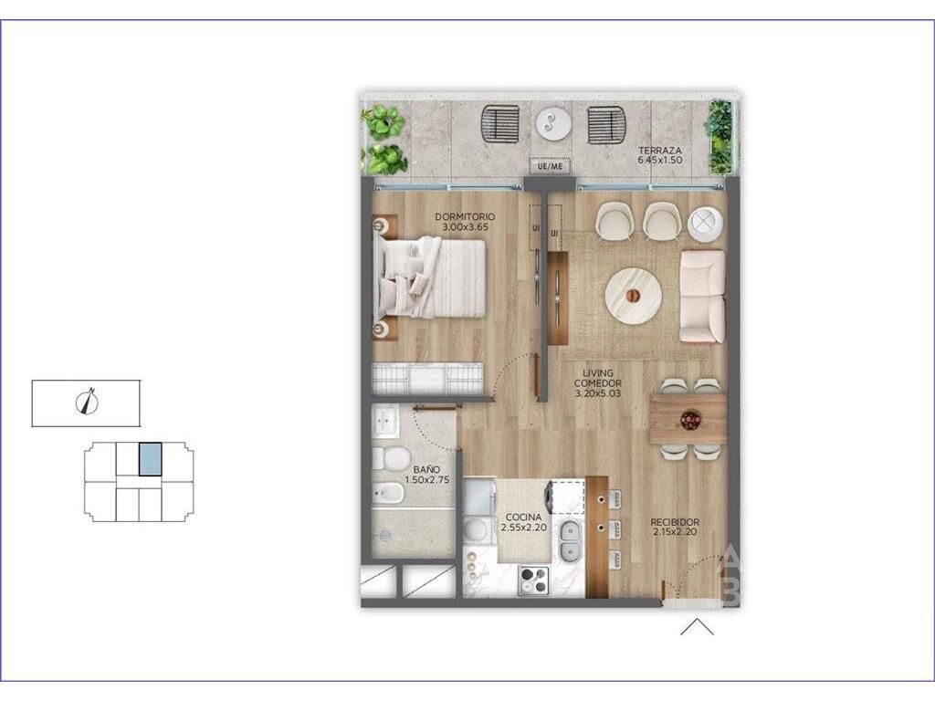 Living comedor con terraza, cocina integrada con placares y campana, horno y anafe, 1 dormitorio con placard, 1 baño completo.
