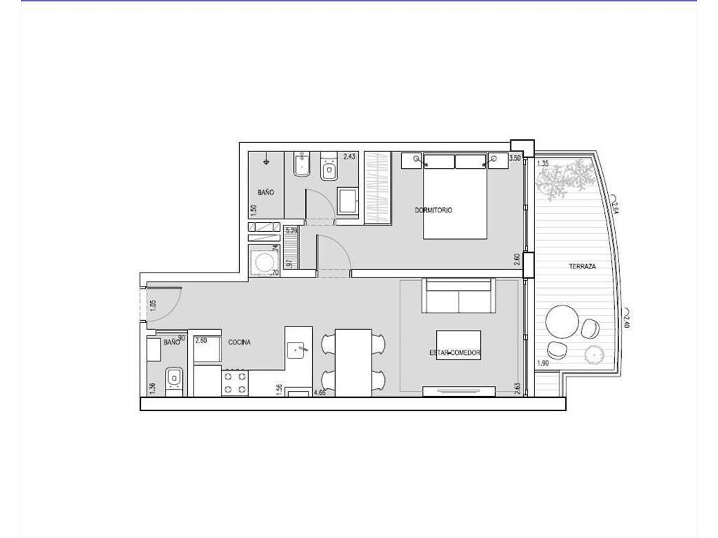 Living comedor con terraza al frente, cocina integrada con placares y conexión para lavarropas y campana. 1 dormitorio con terraza y placard,