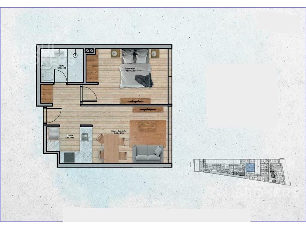 Living comedor con cocina integrada con placares, 1 dormitorio con placard, 1 baño completo.